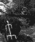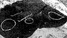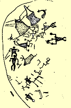 In the human figures the typical head representation is round and solidly cut out and has no indication of facial features. Rarely the shape is oval. A few of the heads are round and outlined instead of solid. One of these a dot in the center of the outline possibly represents some facial feature.